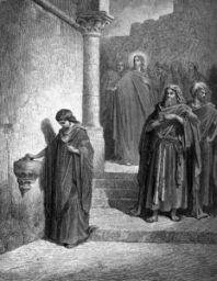 Potem, usiadłszy naprzeciw skarbony, przypatrywał się, jak tłum wrzucał drobne pieniądze do skarbony. Wielu bogatych wrzucało wiele. Przyszła też jedna uboga wdowa i wrzuciła dwa pieniążki, czyli jeden grosz.