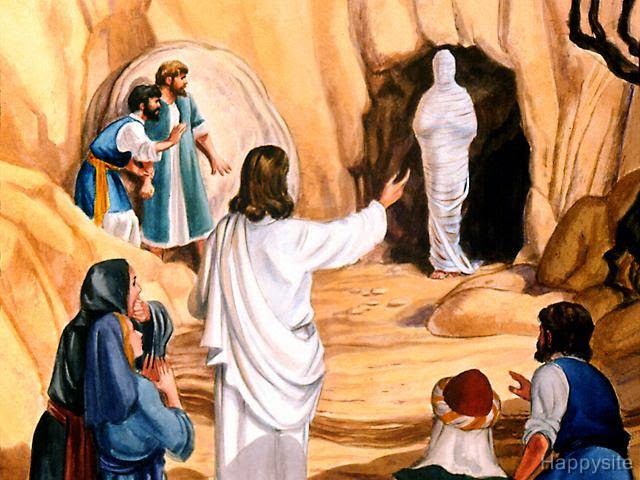 Usunięto więc kamień. Jezus wzniósł oczy do góry i rzekł: «Ojcze, dziękuję Ci, że Mnie wysłuchałeś. Ja wiedziałem, że Mnie zawsze wysłuchujesz. Ale ze względu na otaczający Mnie tłum to powiedziałem, aby uwierzyli, że Ty Mnie posłałeś». To powiedziawszy, zawołał donośnym głosem: «Łazarzu, wyjdź na zewnątrz!» I wyszedł zmarły, mając nogi i ręce przewiązane opaskami, a twarz jego była owinięta chustą. Rzekł do nich Jezus: «Rozwiążcie go i pozwólcie mu chodzić».