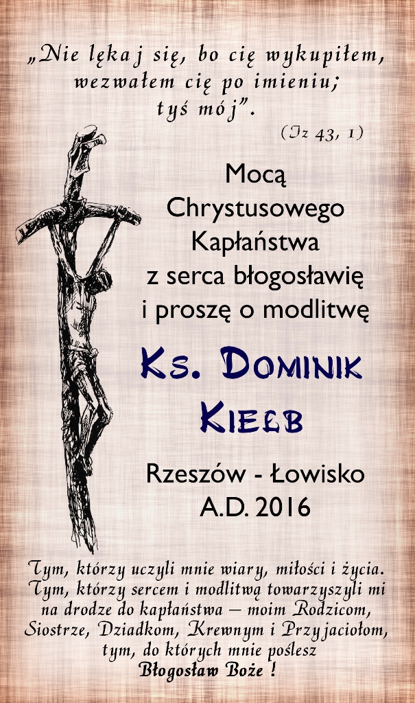 Ks. Dominik Kiełb ur. 05.08.1991 roku w Rzeszowie. Pochodzi z parafii pw. Ignacego Antiocheńskiego i Maksymiliana Kolbe w Łowisku. Ukończył Liceum ogólnokształcące im. Tadeusza Kościuszki w Sokołowie Młp. Obronił pracę magisterską pt.: Eucharystia w życiu duchowym błogosławionego Karola de Foucauld napisaną na seminarium z teologii duchowości pod kierunkiem ks. dra Pawła Synosia. Praktykę diakońską odbył w parafii Nienaszów.
