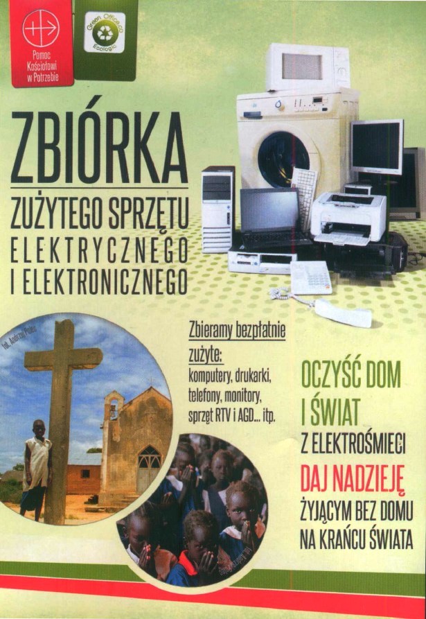 W najbliższą środę o godz. 15.00 - będziemy mogli wesprzeć papieską organizację Kirche In Not (POMOC KOŚCIOŁOWI W POTRZEBIE), polegający na zbiórce zużytego sprzętu elektrycznego i elektronicznego: stare komputery, monitory, klawiatury, drukarki, telewizory, radia, magnetofony, telefony komórkowe, pralki, lodówki, żelazka, odkurzacze, kuchenki, mikrofalówki, kable, baterie, akumulatory, itp. Ulotki są na stoliku pod chórem i na bocznych ołtarzach.